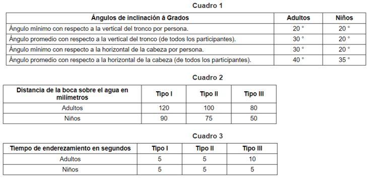 Inmediatamente después de que el sujeto se haya relajado y esté con la cara en el agua, simulando un estado de agotamiento total, se deben soltar sus pies; se anotará el tiempo transcurrido, con una aproximación de una décima de segundo, desde el momento en que se suelten los pies del sujeto hasta que su boca esté fuera del agua; dicha prueba anterior se realizará un total de seis veces en el dispositivo de prueba de referencia, y se desecharán el tiempo más largo y el más breve.