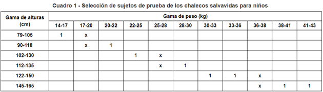 Respecto de los chalecos salvavidas para niños, las pruebas se llevarán a cabo con nueve personas en buen estado físico y en cuanto a los chalecos salvavidas para bebés, las pruebas se efectuarán, como mínimo, con cinco personas en buen estado físico. Todos los sujetos de prueba se elegirán de conformidad con lo dispuesto en el siguiente cuadro: